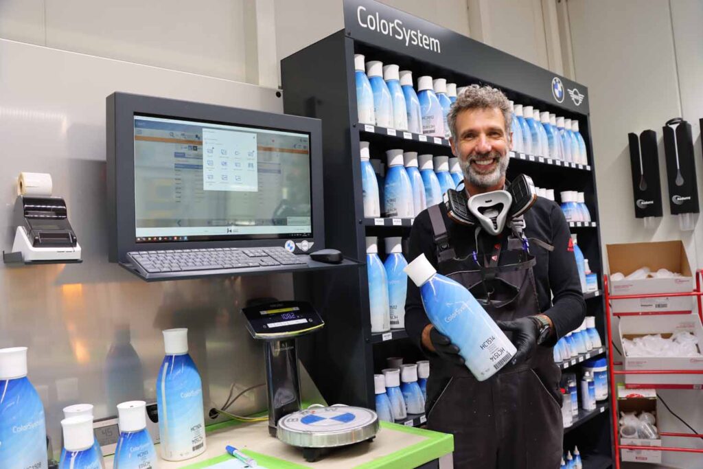 Além da formação, realizamos aqui em Mechelem diversos testes aos nossos sistemas de repintura. Quando anunciamos, neste ano de 2025, a parceria com o grupo BMW para sermos a marca de tintas recomendada para repintura automóvel, isso exigiu um trabalho de base muito amplo.
