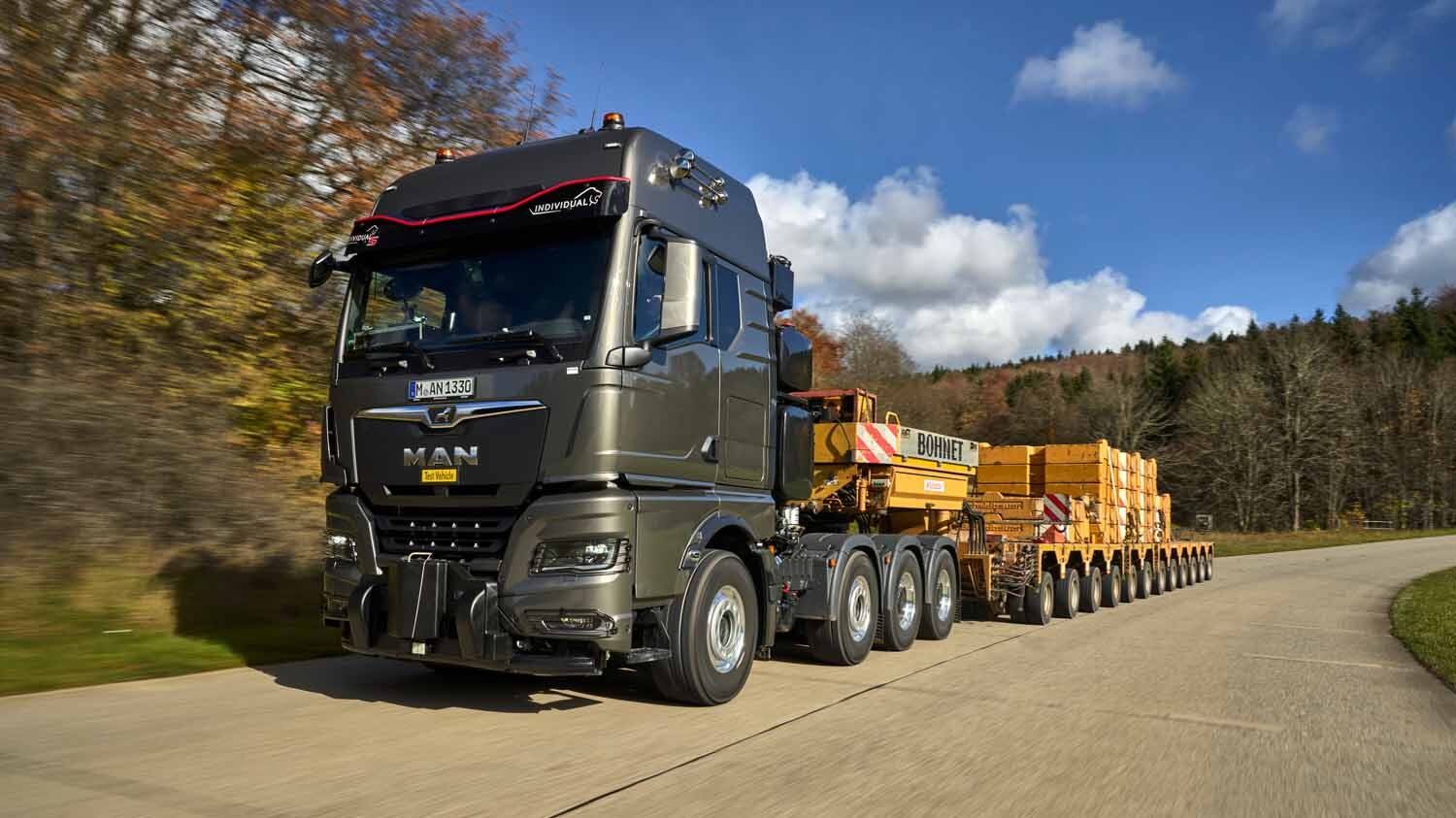 O veículo de quatro eixos, com 640 cv, tem a capacidade de movimentar grandes turbinas com elevado peso para parques eólicos, transformadores de alta tensão ou até submarinos completos. Entre outros destaques, o MAN TGX integra uma embraiagem com conversor de binário, uma caixa de velocidades especial concebida para cargas extremas e potentes sistemas hidráulicos e de ar comprimido, que permitem a direção e o nivelamento precisos dos 30 ou mais eixos dos reboques de transporte pesado, em qualquer situação de condução.