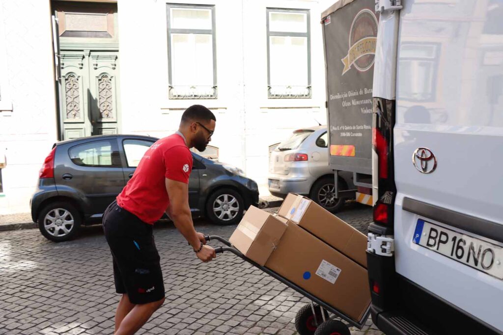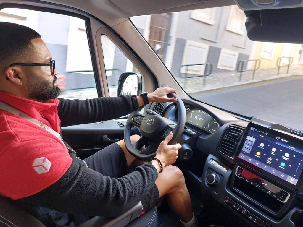 Depois de carregada e preenchidos todos os critérios de segurança, saímos de Loures rumo ao primeiro local de entrega, no centro de Lisboa. Percorridos os primeiros quilómetros ao volante do furgão Proace, Luis Tehmurasp refere-nos que “gostei logo da brecagem deste Toyota, algo muito importante para efetuarmos as manobras e para conseguirmos tanto circular como estacionar o furgão em espaços apertados, típicos de uma cidade como Lisboa.