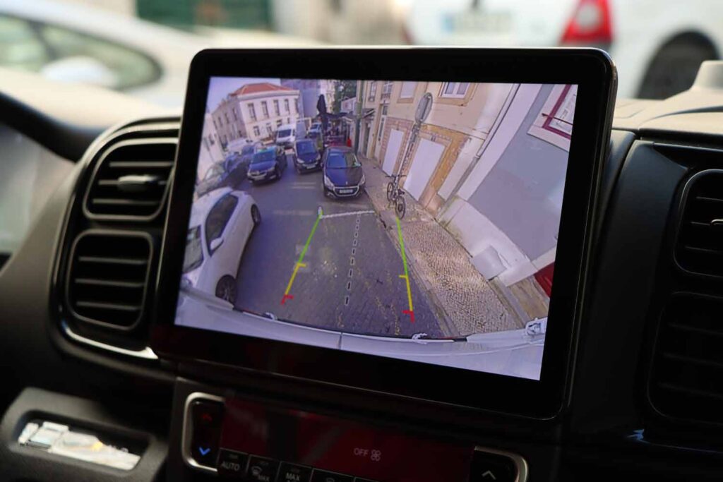 A câmara de marcha-atrás é excelente. Ajuda-nos a estacionar com total confiança e a resolução da imagem permite termos uma precisão ainda maior no estacionamento. Isso é fundamental, porque na nossa área de atividade que é distribuição expressa, conseguir estacionar bem poupa-nos tempo nas entregas e diminui o risco de o furgão ser danificado.